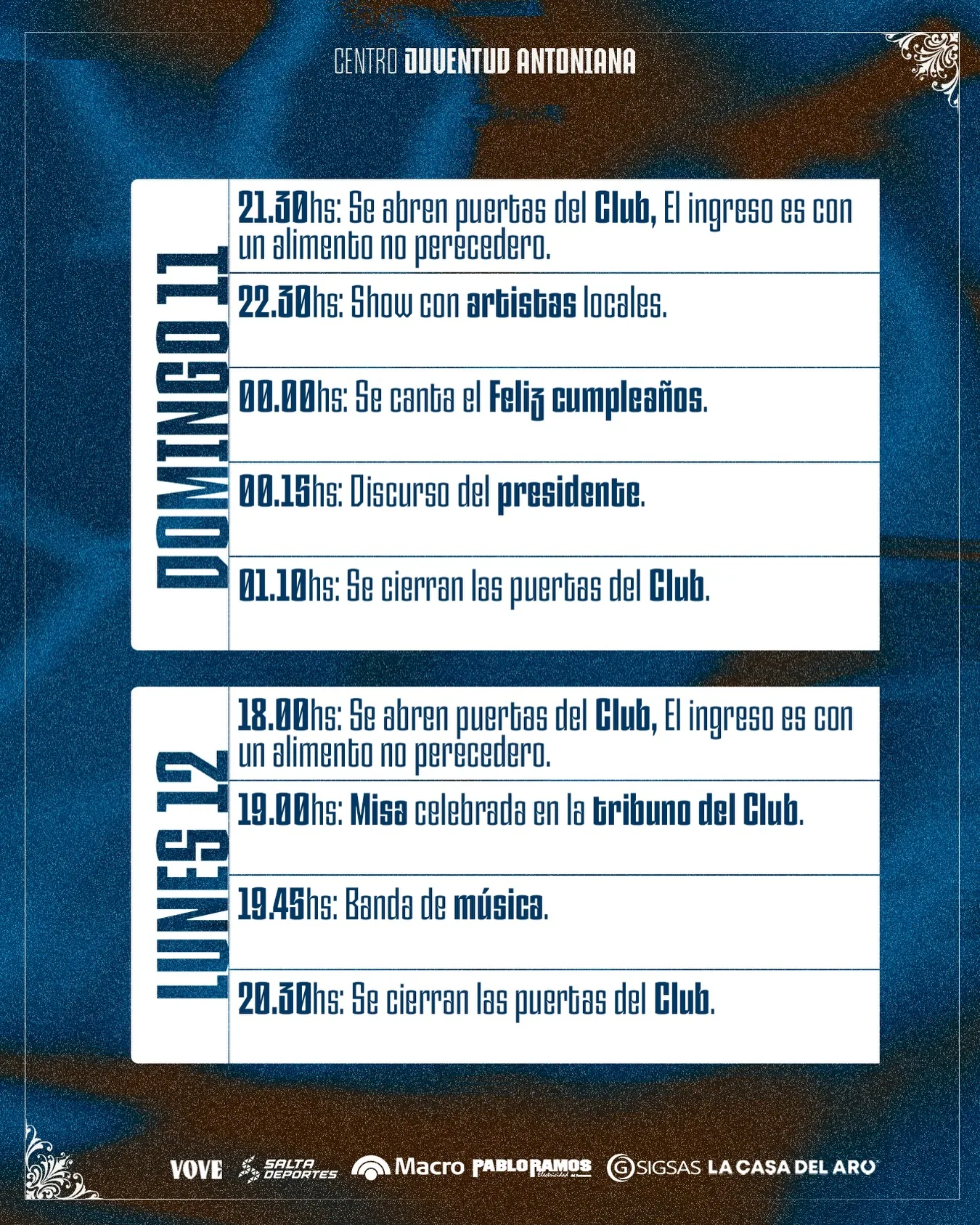El Centro Juventud Antoniana invita a los hinchas a los festejos por los 110 años de vida del club. Las actividades iniciaran este domingo 11 de enero desde las 21.30 con la apertura de puertas. Se cantará el feliz cumpleaños y luego el presidente Segura brindará un discurso. La entrada para participar será un alimento no perecedero.