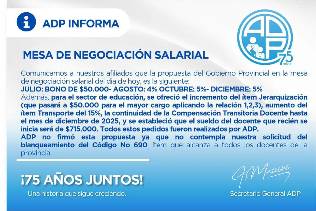 Sorpresivamente, y a contramano con la buena nueva de un nuevo acuerdo paritario, distintos gremios de empleados del Estado no firmaron la propuesta presentada por el Gobierno. En su página web, la Asociación Docente Provincial público: “ADP no firmó esta propuesta ya que no contempla nuestra solicitud del blanqueamiento del Código N° 690, ítem que alcanza a todos los docentes de la provincia”.