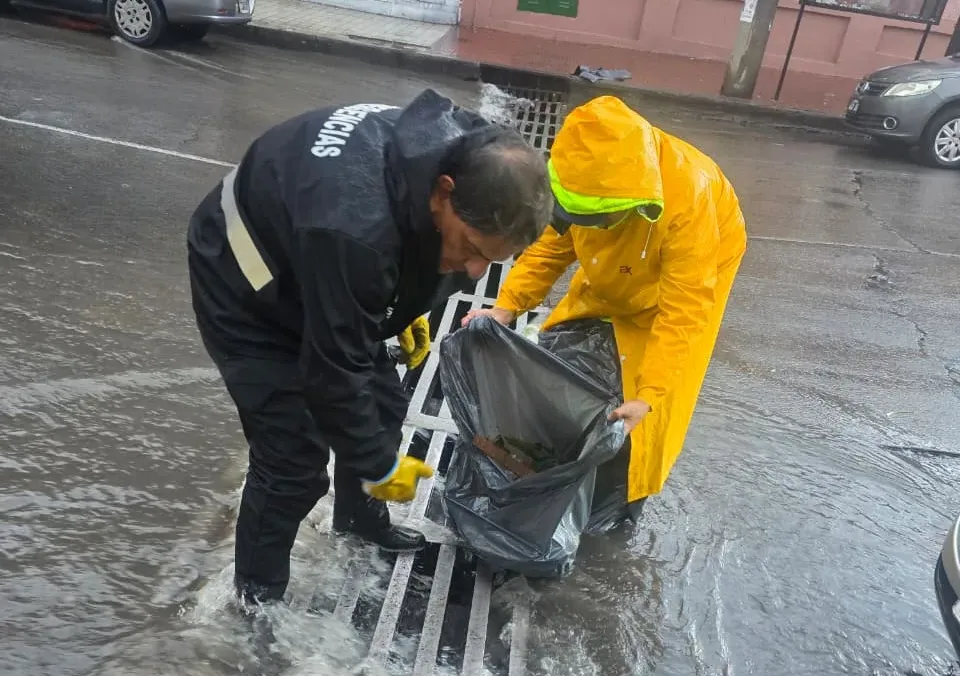 Debido al agua acumulada, operarios del municipio limpiaron rejillas de desagües pluviales. Además, retiraron una rama de gran porte que estaba a punto de caerse en el natatorio Perón, entre otras acciones.
