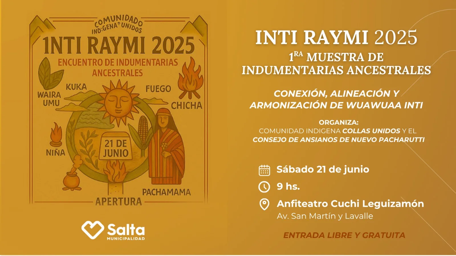La Municipalidad de Salta, a través de la Agencia de Cultura Activa, acompaña e invita a la comunidad a participar de la celebración INTI RAYMI 2025, que incluirá el 1° Encuentro de Indumentarias Ancestrales, una propuesta para revalorizar la memoria, la identidad y los saberes de nuestros pueblos originarios.
