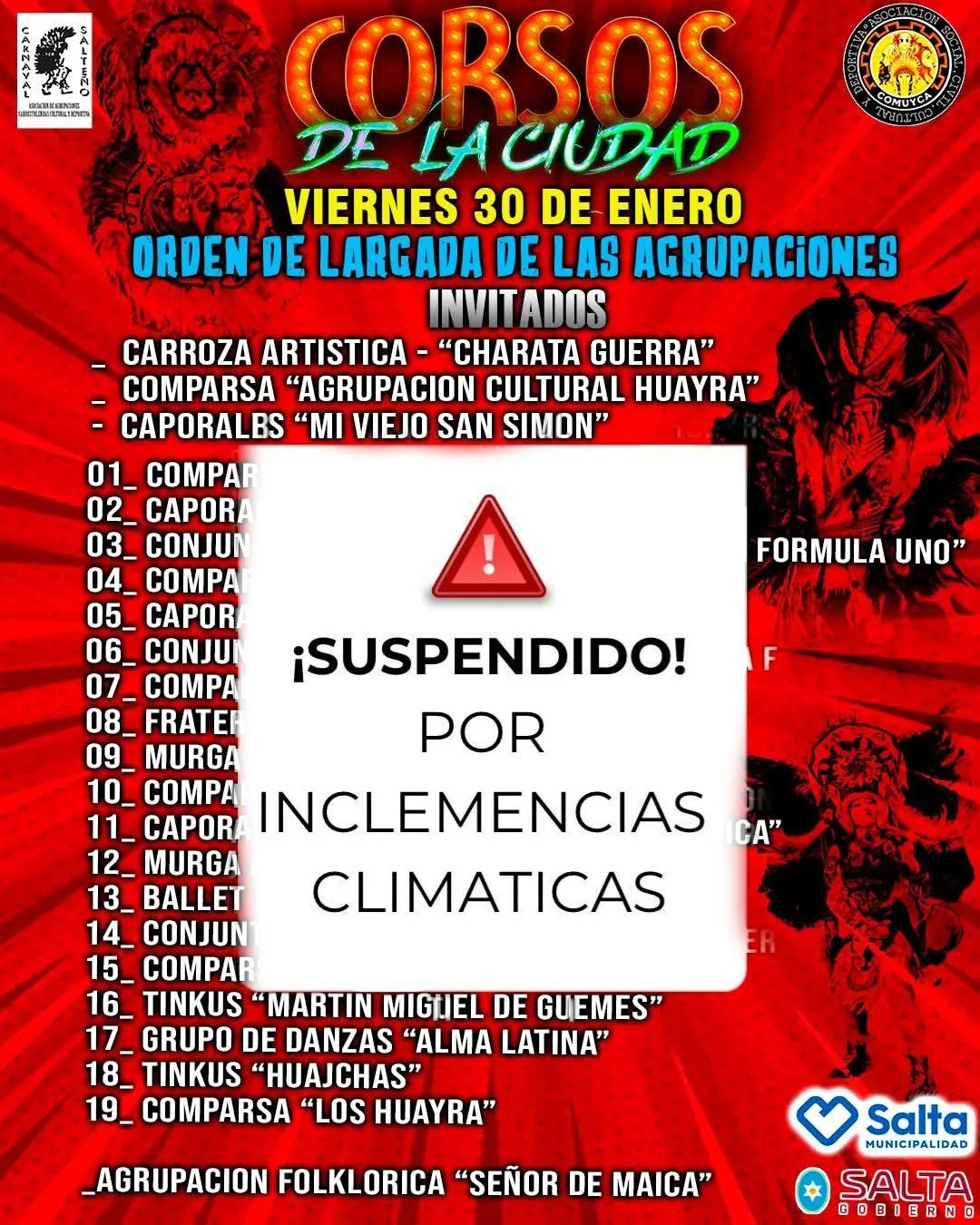 La lluvia pronosticada para la noche del viernes termino cancelando el Corso capitalino. Para la jornada estaban previstos los desfiles de las dos agrupaciones que quedaron pendientes del domingo anterior. Se trata de la Comparsa Agrupación Cultural Huayra y Caporales Mi Viejo San Simón.