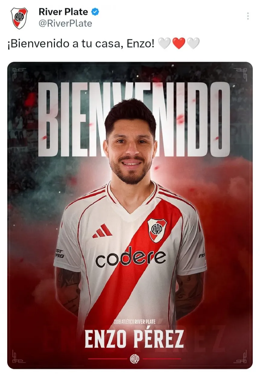 En redes sociales empezaron los guiños al campeón de la Copa Libertadores 2018. “¡Vuelvo yo, Marcelo!”, fue la frase que compartieron en un posteo, como recuerdo de la frase que el mediocampista le habría dicho al DT (“atajo yo, Marcelo”) la noche que atajó frente a Independiente Santa Fe por Copa Libertadores. Finalmente, se le recibió con todos los honores: “¡Bienvenido a tu casa, Enzo!”, se expresó el club en sus canales de comunicación oficial junto a una gráfica del volante nuevamente con el manto riverplatense.
