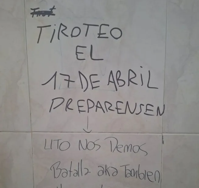 Autoridades del colegio 5033 Ernesto Miguel Aráoz en la zona sur de la Capital reportaron el miércoles 15 de abril, al Sistema de Emergencias 911 el hallazgo de un mensaje con contenido amenazante escrito en un baño de hombres ubicado en la primera planta del establecimiento.