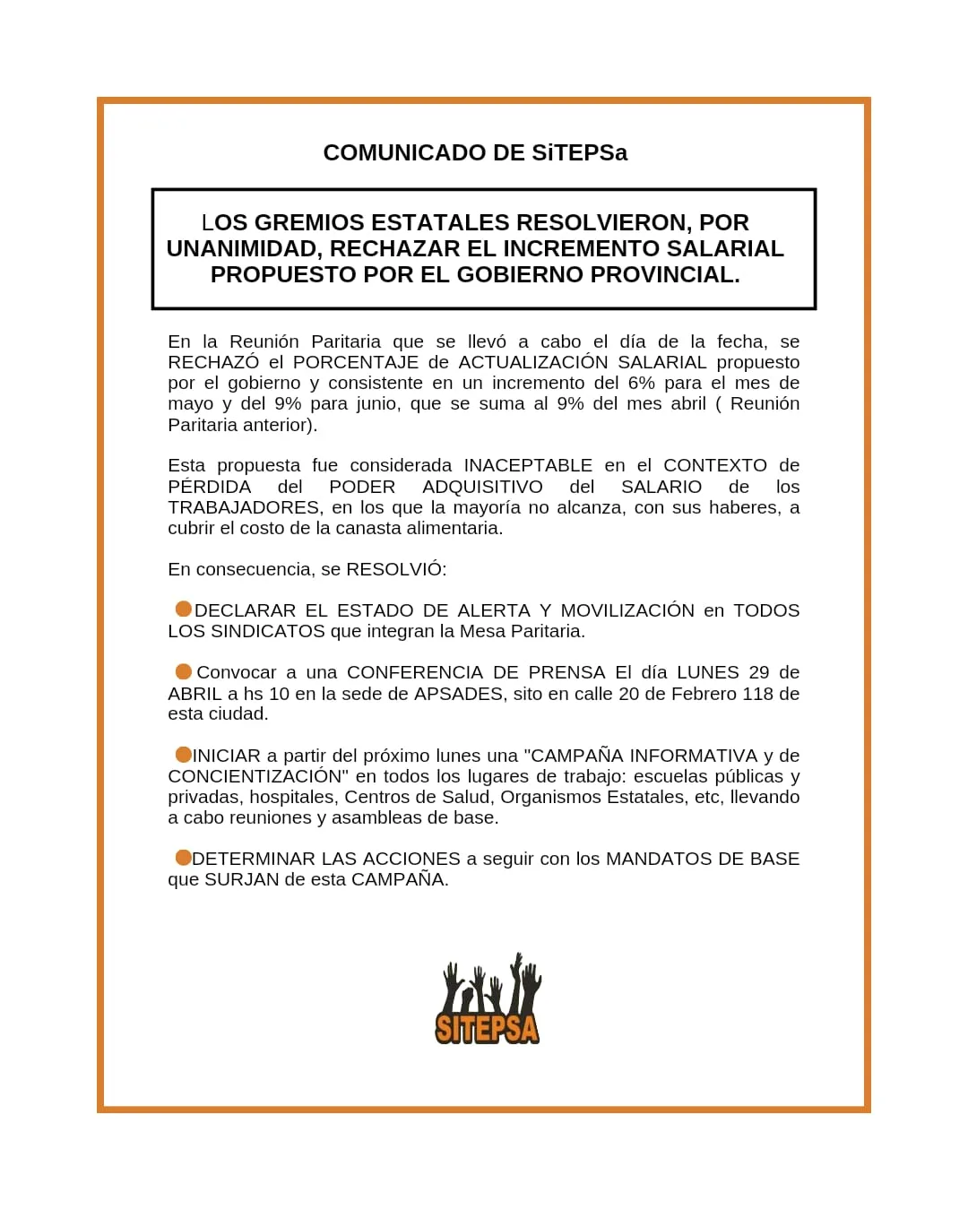 - Declarar el estado de alerta y movilización en todos los sindicatos que integran la mesa paritaria