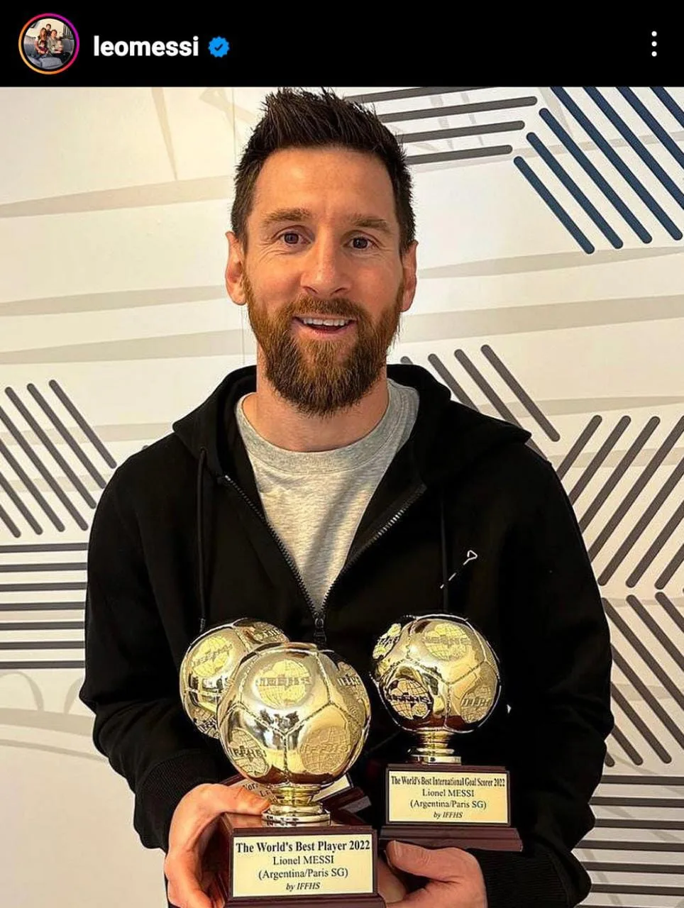 La Pulga publicó una foto este domingo donde se lo puede ver posando junto a los tres premios: Mejor Jugador, Mejor Armador de Jugadas y Mejor Goleador Internacional. Todos corresponden a la temporada 2022 y, aunque se habían anunciado a principios de año, recién fueron entregados al rosarino en las últimas horas.