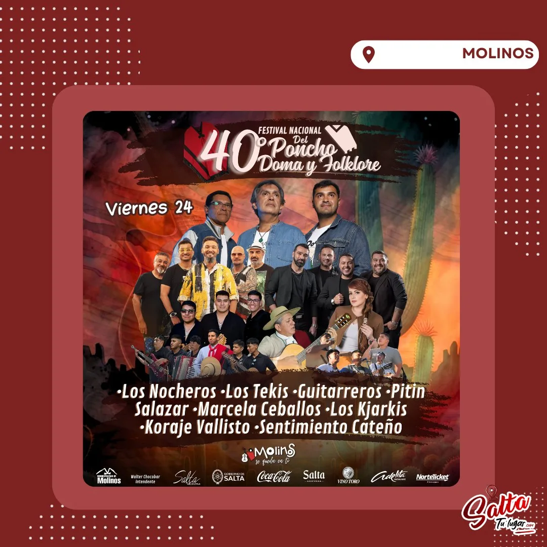 La Municipalidad de Molinos confirmó la realización del Festival Nacional del Poncho Doma y Folklore para el próximo 24 y 25 de enero de 2025 en su 40° edición. En este cumpleaños 40, el espectáculo se desarrollará en la cancha municipal. La venta de entradas tiene agotadas las plateas, solo quedan a la venta entradas populares que tienen un costo de 20 mil pesos.