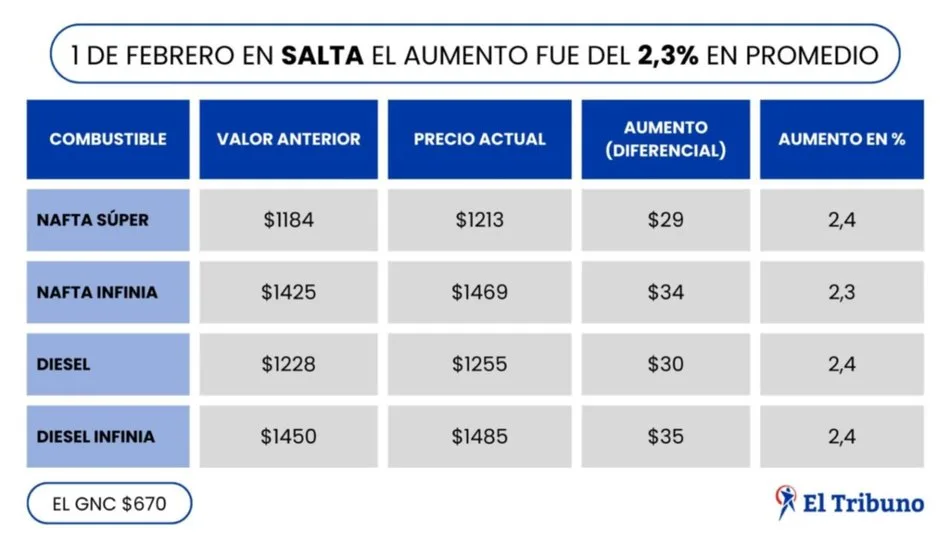 Es el segundo aumento en lo que va del 2025, el 3 de enero Salta sufrió una suba de un 2,5%. Por su parte el GNC permace con los mismos valores ($670).
