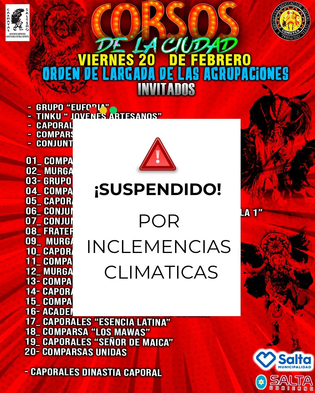 Para no ser menos, la lluvia cobro protagonismo nuevamente en los Corsos de la Ciudad. La organización del Corso de la Ciudad informó la suspensión de la jornada prevista para este viernes 20 de febrero debido a las condiciones climáticas adversas y al alerta meteorológico vigente en la capital salteña.