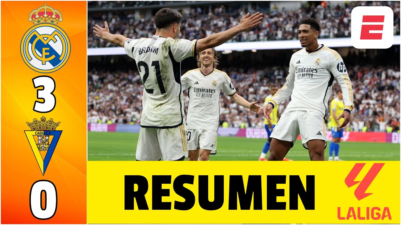 Real Madrid goleó como local a Cádiz por 3-0, en un partido correspondiente a la 34ª fecha de La Liga de España. El Merengue recién logró destrabar el encuentro en el segundo tiempo y, gracias a la contundente derrota por 4-2 de Barcelona ante Girona, se consagró campeón del certamen español de manera diferida.