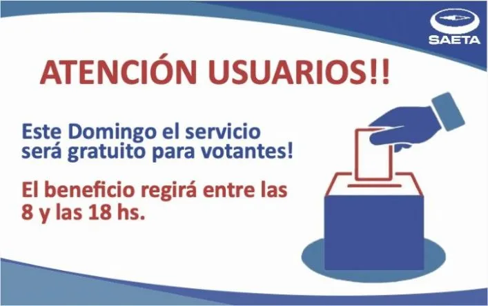 En el marco de la resolución 435/2023 del Ministerio de Transporte de la Nación, SAETA informa a sus usuarios que este domingo en que se celebrarán las elecciones generales, el servicio de colectivos en toda el área metropolitana será gratuito para los votantes.