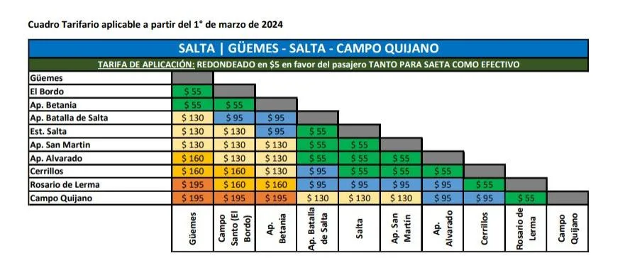 Tras el aumento de enero, a partir del 1 de marzo hacer el recorrido completo (Salta – Quemes) pasará a costar $195 pesos. Mientras que viajar de Salta a Campo Quijano tendrá un costo de $130 pesos.